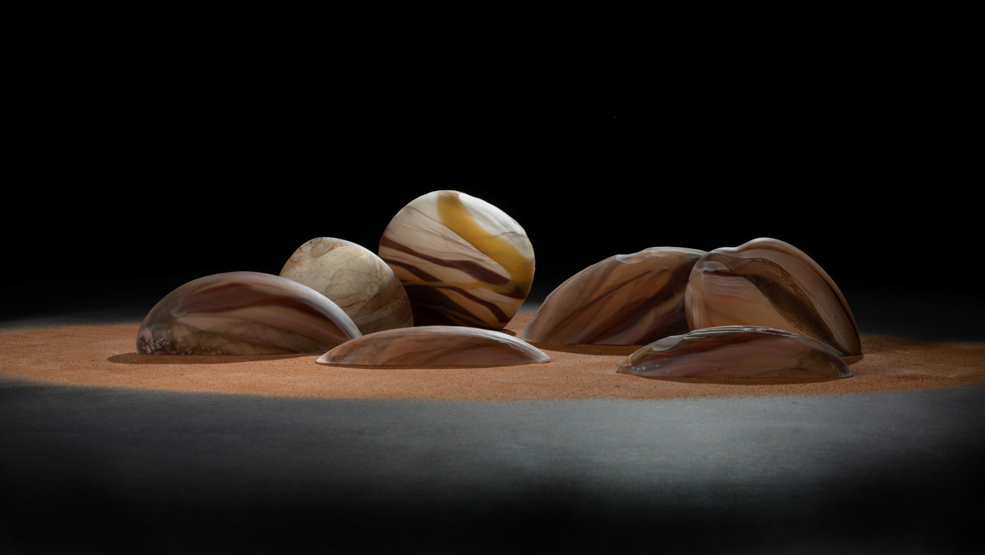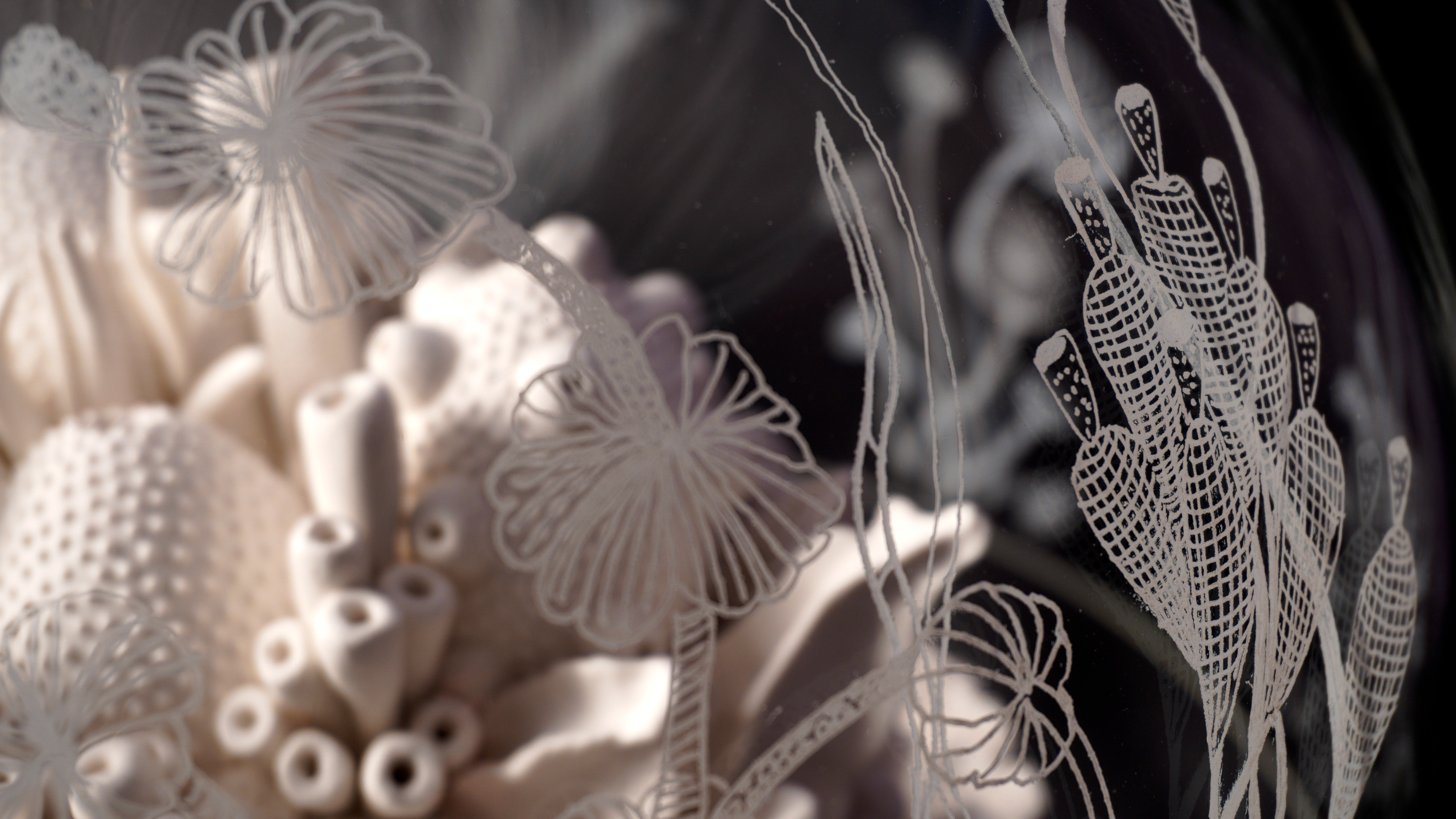 Hand blown glass dome with sea flora etchings incasing ceramic coral